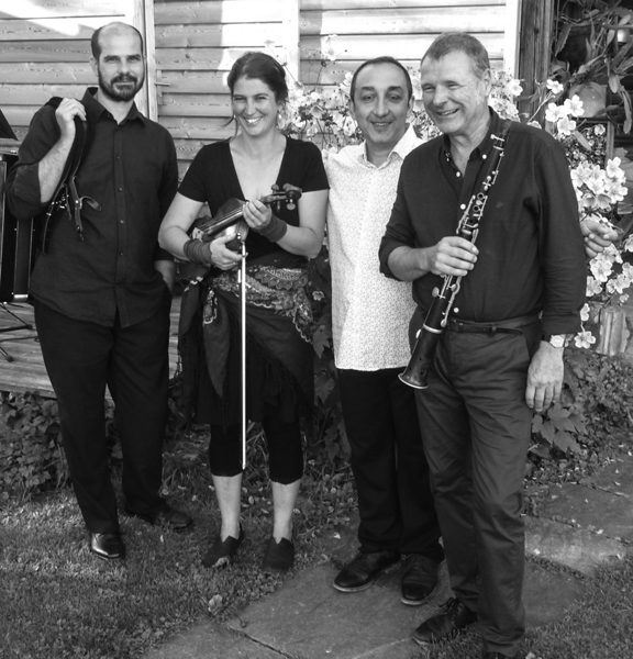 Samuel Freiburghaus (Klarinetten, Taragot, Örgeli, Stimme), Corina Landes (Violine, Stimme), Roberto Vacca (Akkordeon, Stimme) und Sorin Gheraliu (Cimbal/Hackbrett)