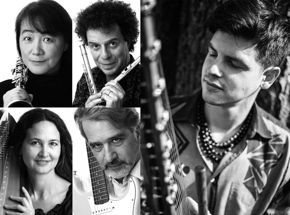 Christoph Bösch (Flöte), Toshiko Sakakibara (Klarinette), Consuelo Giulianelli (Harfe), Maurizio Grandinetti (Gitarre) und Gast Josh Doughty (Kora)